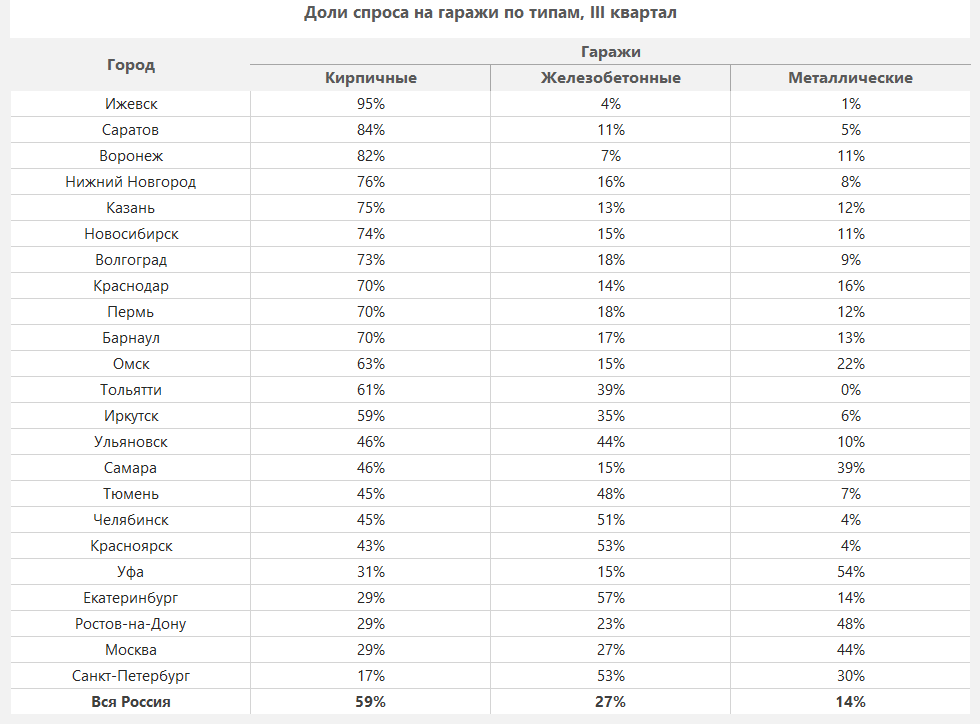 Распределение «внутригаражного» спроса по типам материала постройки также ожидаемо оказалось в пользу более «монолитных» конструкций из кирпича и железобетона: кирпичные гаражи популярнее прочих в 15 регионах из 23, а еще в 5 предпочтение отдают железобетонным. Самые дешевые металлические гаражи удерживают высочайшую популярность лишь в Уфе и Ростове-на-Дону. Велика их доля и в Самаре, где они, впрочем, все же уступают кирпичным.